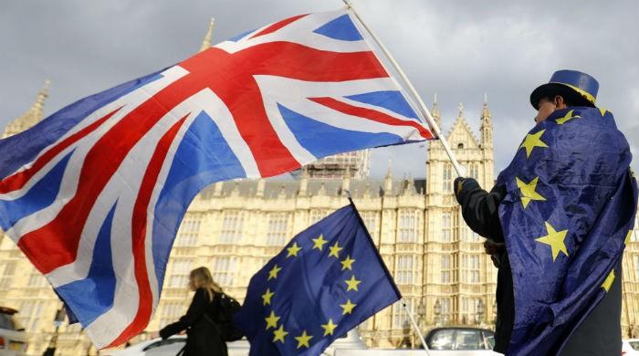 In this file photo taken on March 28, 2018 An anti-Brexit demonstrator waves a Union flag alongside a European Union flag outside the Houses of Parliament in London. A bill enacting Britain’s decision to leave the European Union has become law...from GEO TV - World https://ift.tt/2txYR8m https://ift.tt/2lA203e